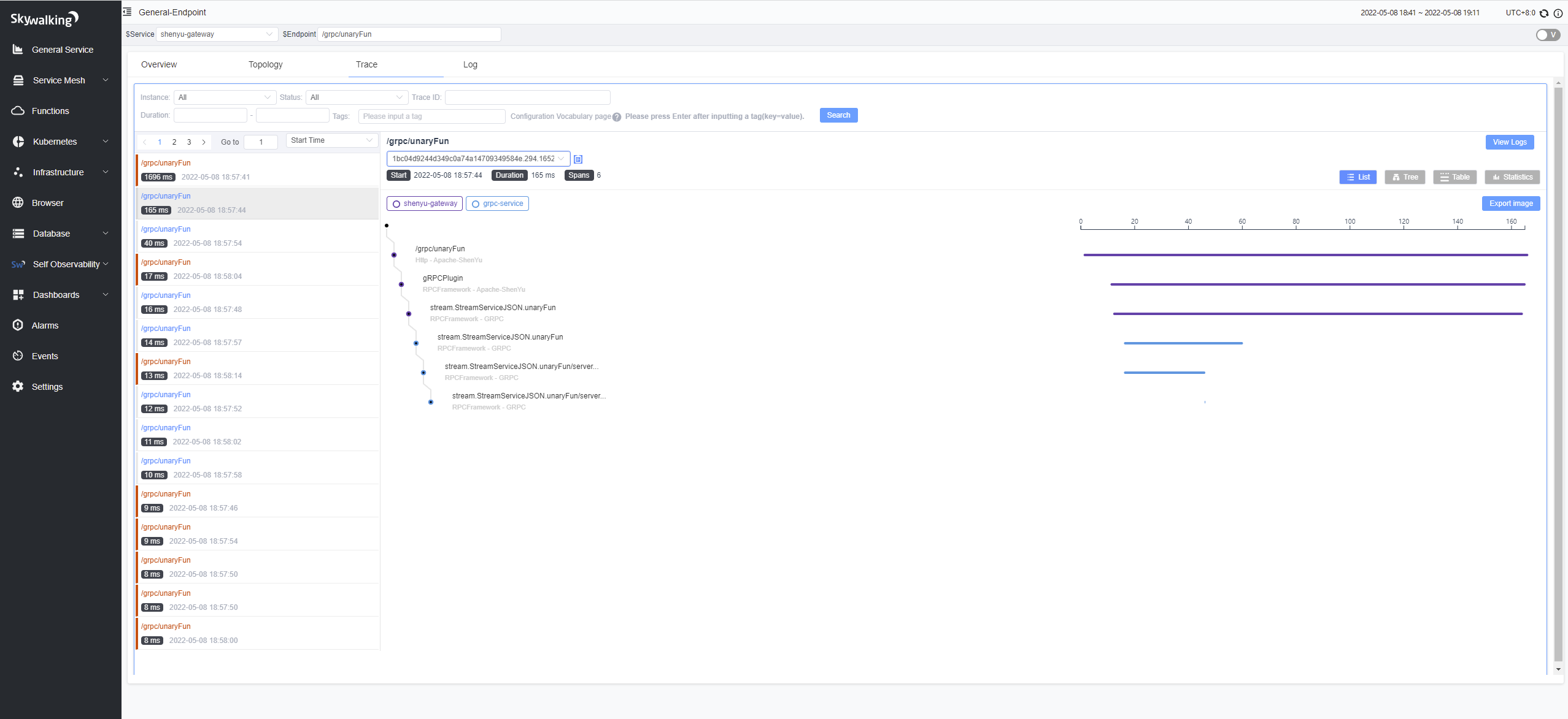 The existing SkyWalking gRPC plugin only supports calls initiated by way of stubs. For the gateway there is no proto file, the gateway takes generalized calls (not through stubs), so tracing RPC requests, you will find that the link will break at the gateway node. In this case, it is necessary to make the gRPC plugin support generalized calls, while at the same time needing to remain compatible and not affect the original tracing method. This is achieved by determining whether the request parameter is a DynamicMessage, and if it is not, then the original tracing logic through the stub is used. If not, then the original tracing logic via stubs is used, and if not, then the generalized call tracing logic is used. The other compatibility is the difference between the old and new versions of gRPC, as well as the compatibility of various cases of obtaining server-side IP, for those interested in the source code.