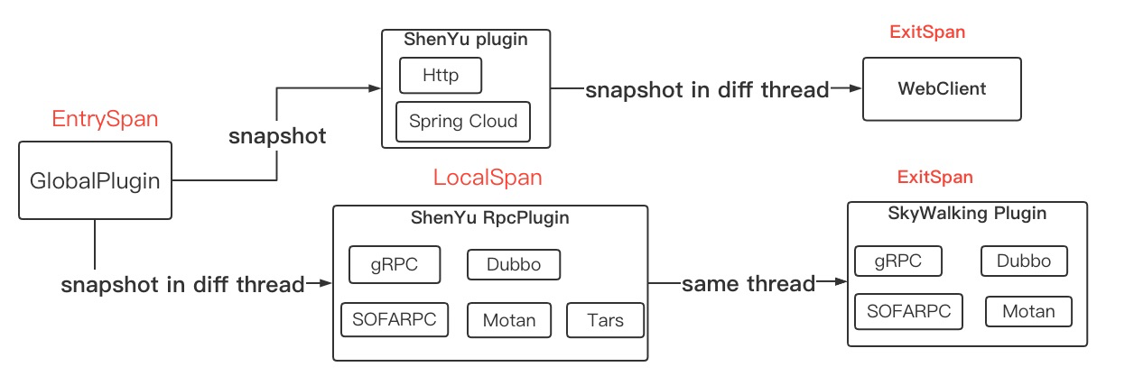Currently this approach is used in the asynchronous WebClient plugin, which can receive asynchronous snapshots. shenYu proxy Http service or SpringCloud service is to achieve span concatenation through snapshot passing. - LocalSpan transit: