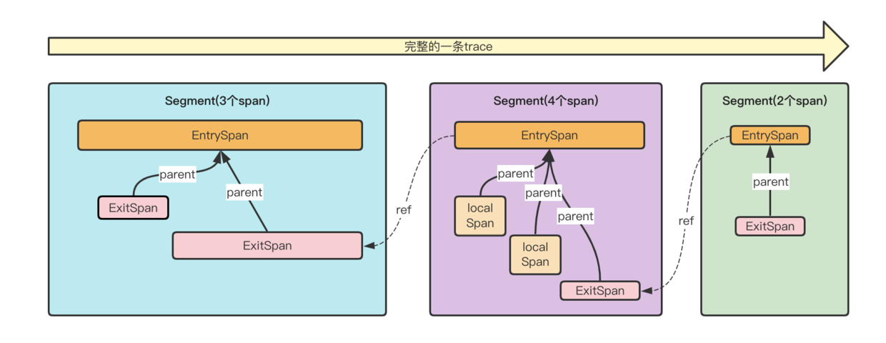 - Segment是SkyWalking中提出的概念,表示一次请求在某个服务内的执行链路片段的合集,一个请求在多个服务中先后产生的Segment串起来构成一个完整的Trace,如下图所示: